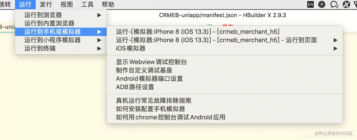然后启动模拟器,重启HbuildX软件,等待一会点击运行>运行带手机或者模拟器 这时候就能看到模拟器的设备了,看不到的话需要关闭HbuildX,先开模拟器再打开HbuoldX编辑器