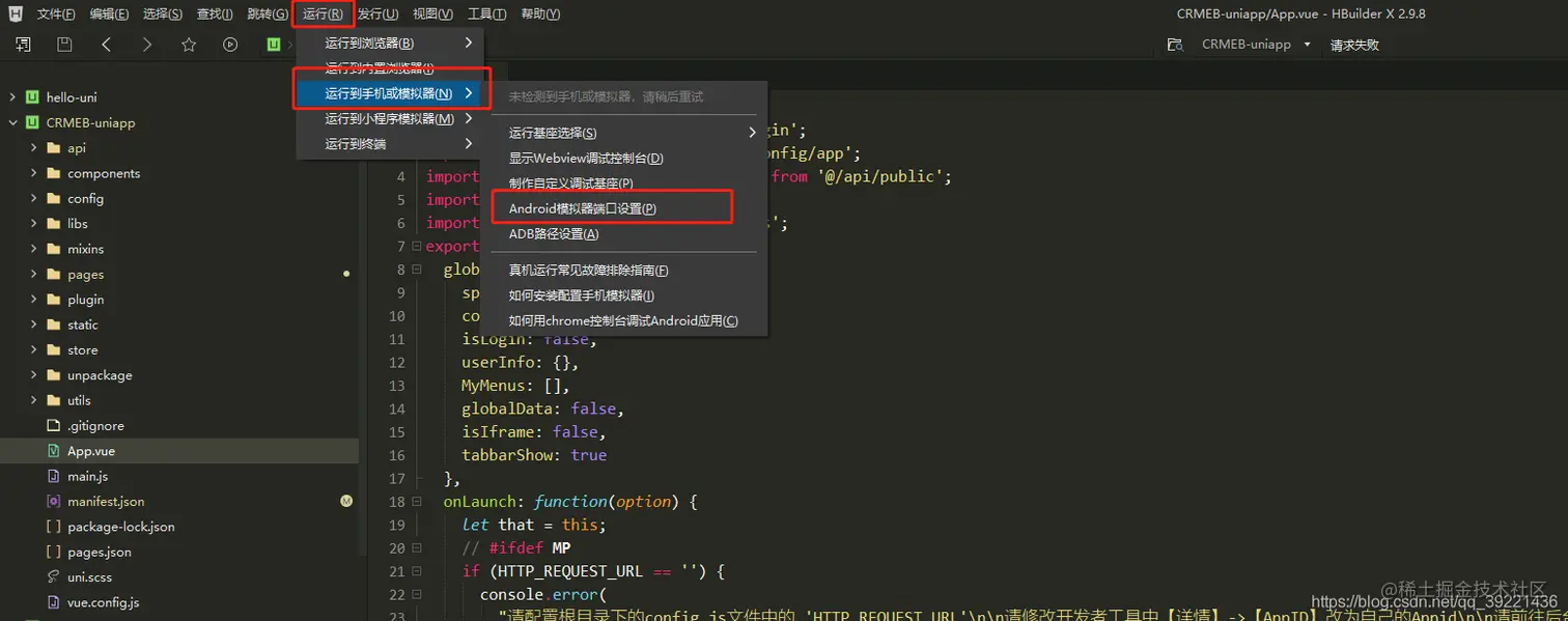 双击App.vue文件>点击运行>运行到手机或模拟器>Android模拟器端口配置