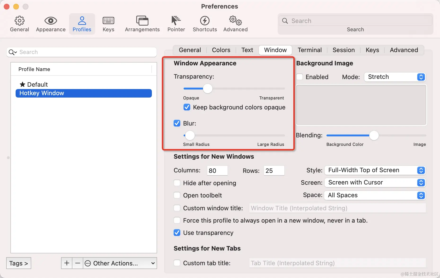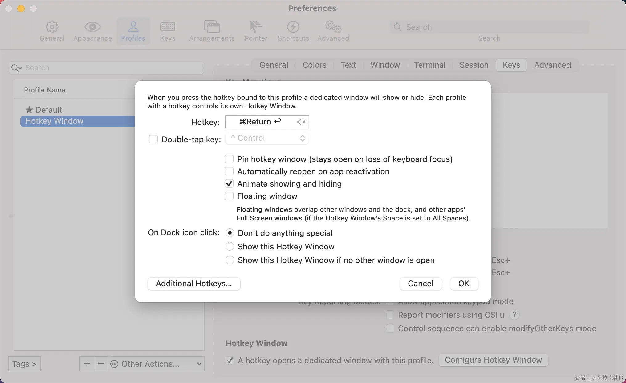 这个功能也非常实用,就是通过快捷键,可以快速的隐藏和打开 iTerm2,示例配置(Commond + Return):