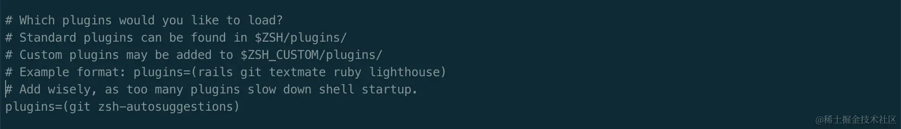 然后编辑 vim ~/.zshrc 文件,找到 plugins 配置,增加 zsh-autosuggestions 插件。