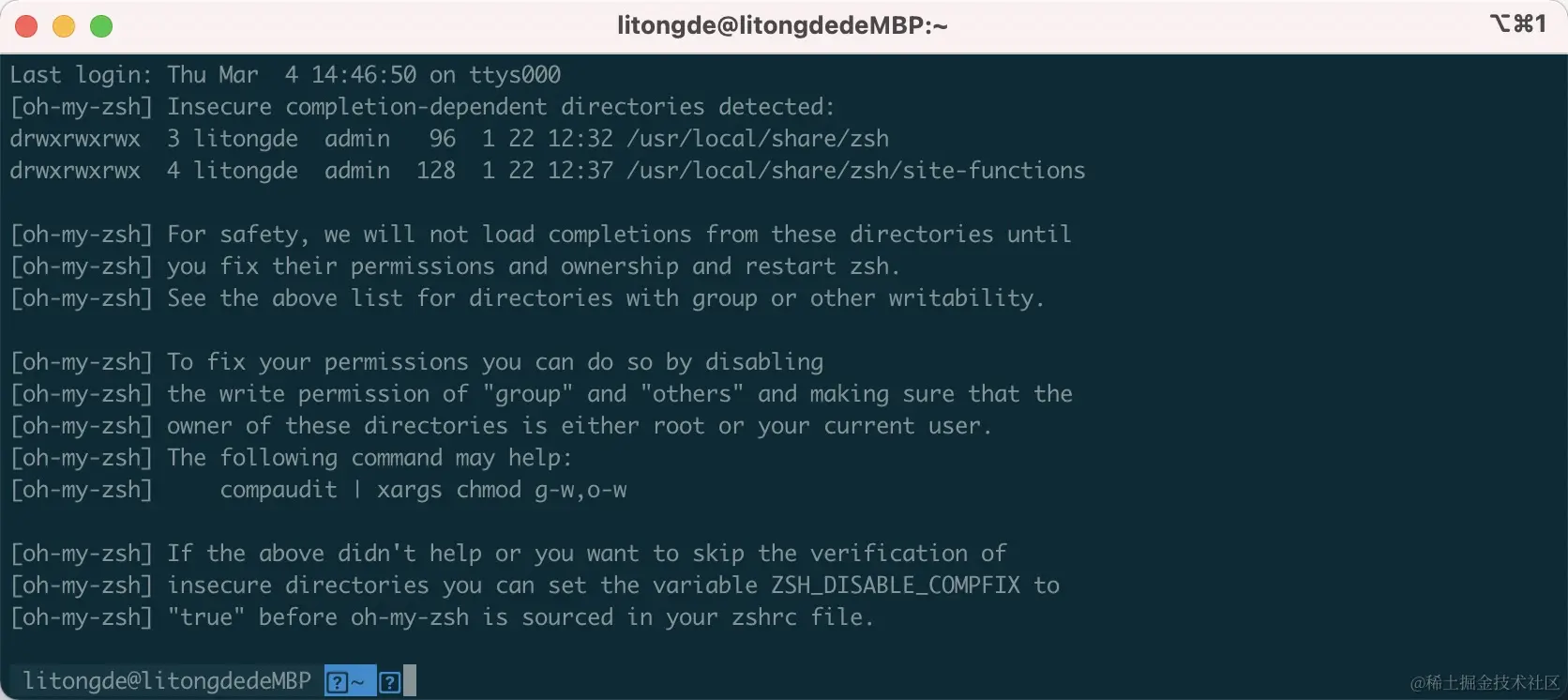 启动 iTerm2 时每次有一大串提示 Insecure completion-dependent directories detected