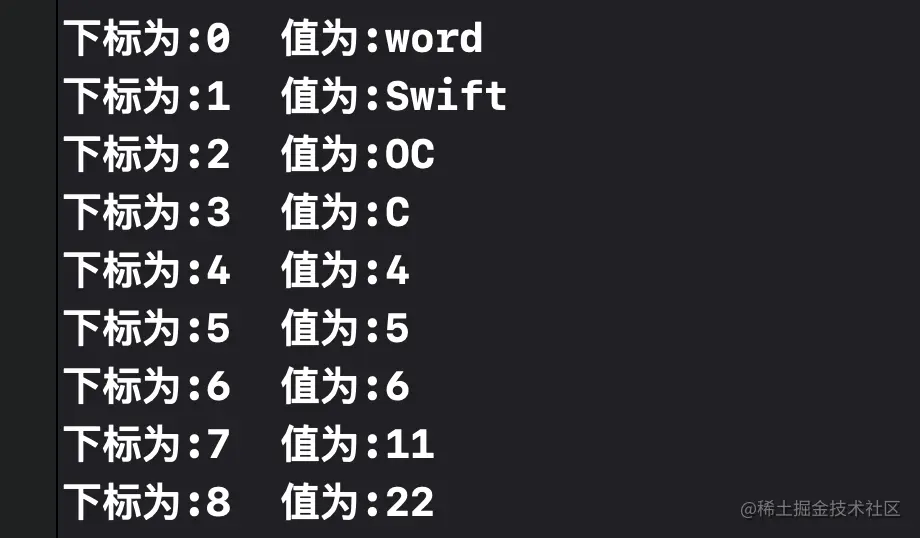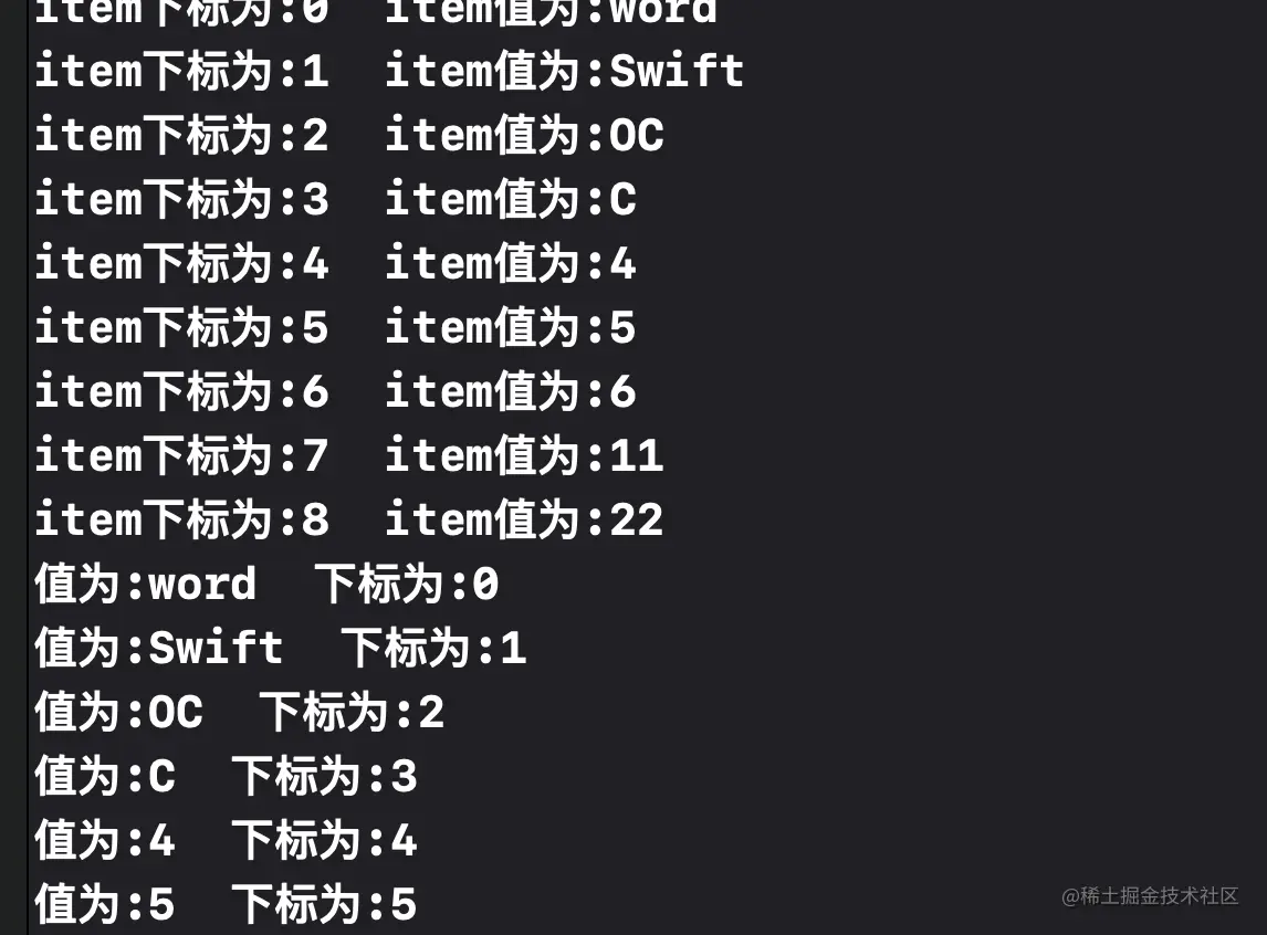 print("item下标为:\(item.offset) item值为:\(item.element)");