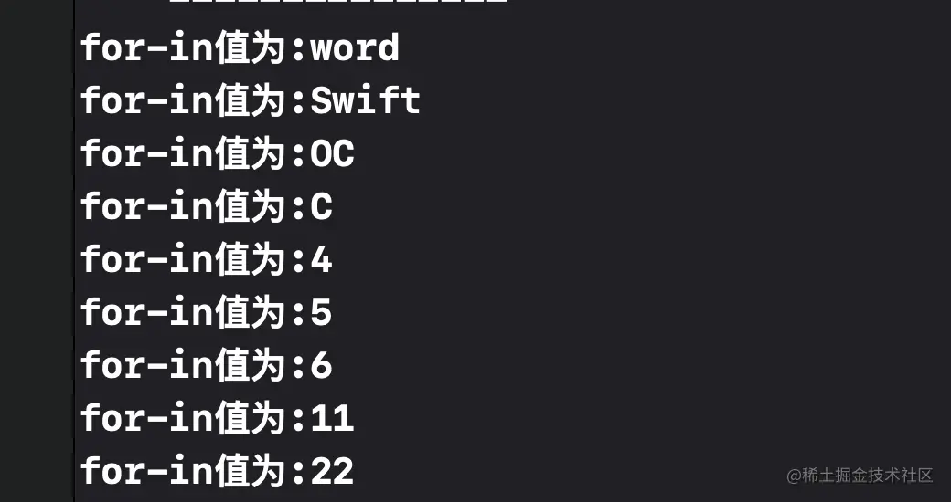 print("for-in值为:\(item)");