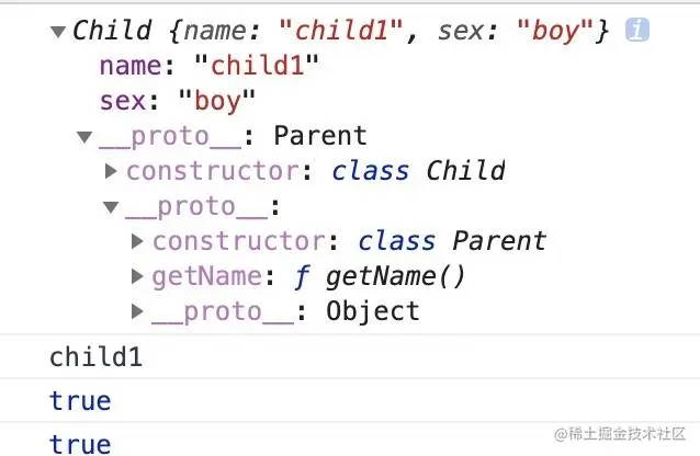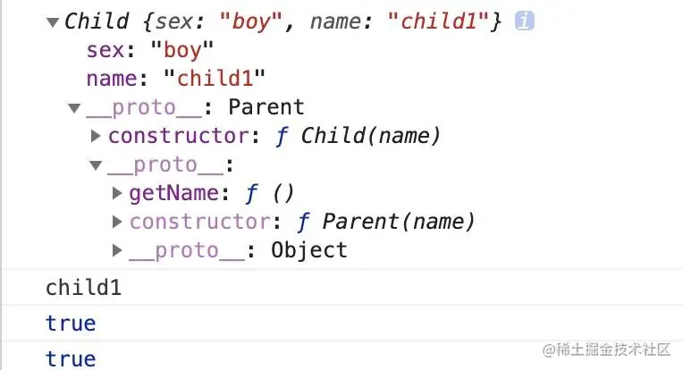 最后两个为 true,是因为 child1 可以沿着它的原型链查找到 Child.prototype 和 Parent.prototype。