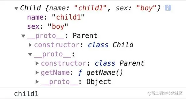 new Child('child1')创建child1的时候,会执行子类constructor中的方法,因此会执行super.getName(),而依靠准则一,此时的constructor中的第二个super指向的是父类的原型对象,因此此时super.getName()会被成功调用,并打印出'child1';(第一个super是当成函数来调用) - 当