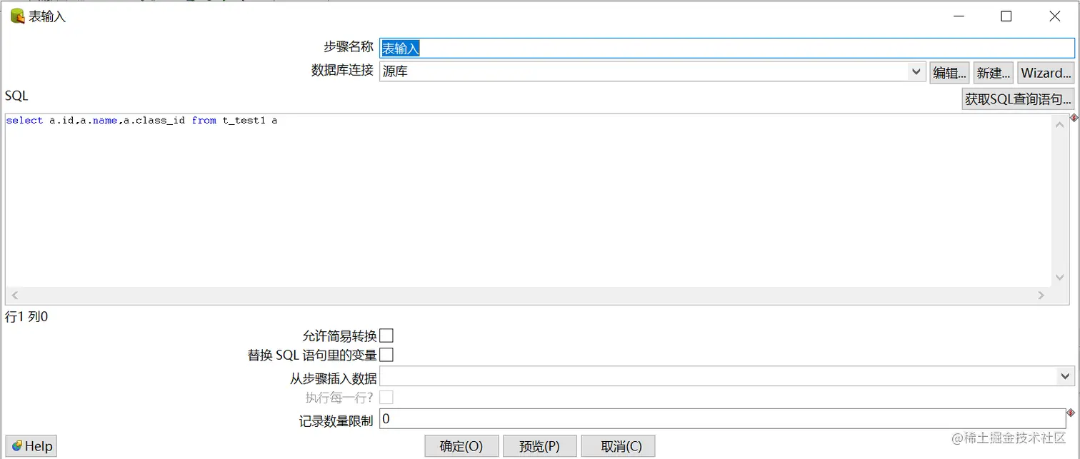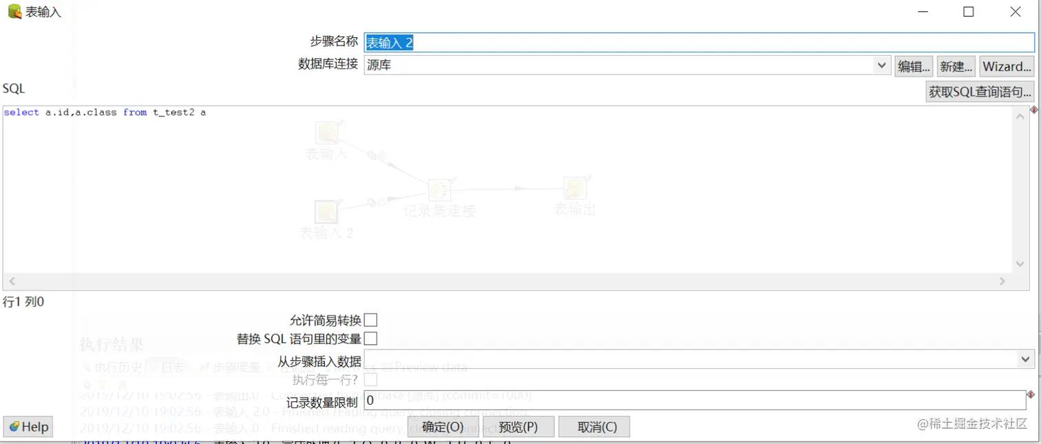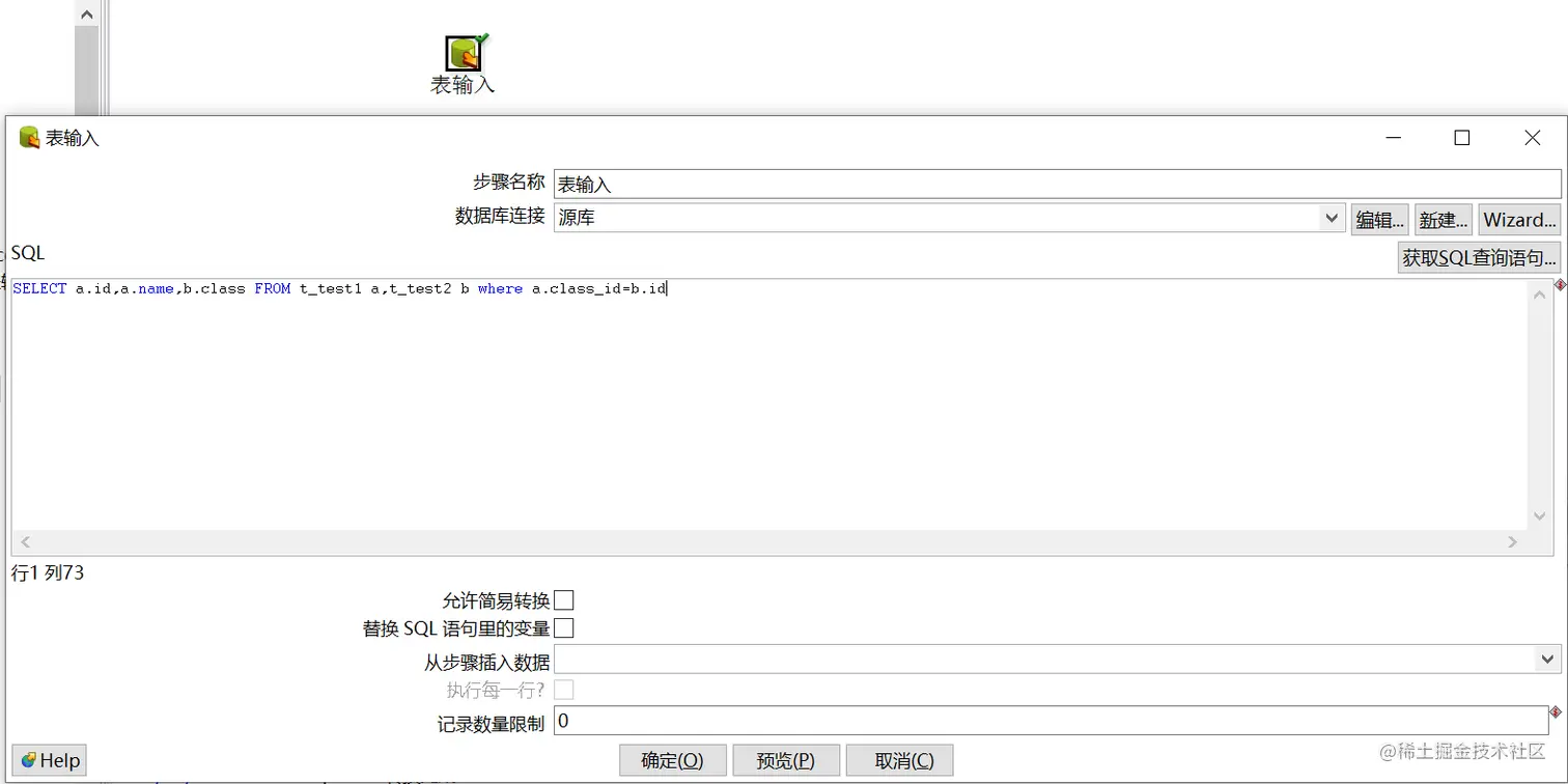 2、选择表输入,双击表输入,在sql一栏里写入关联sql语句,点击预览后,查询出相关数据,点击确定