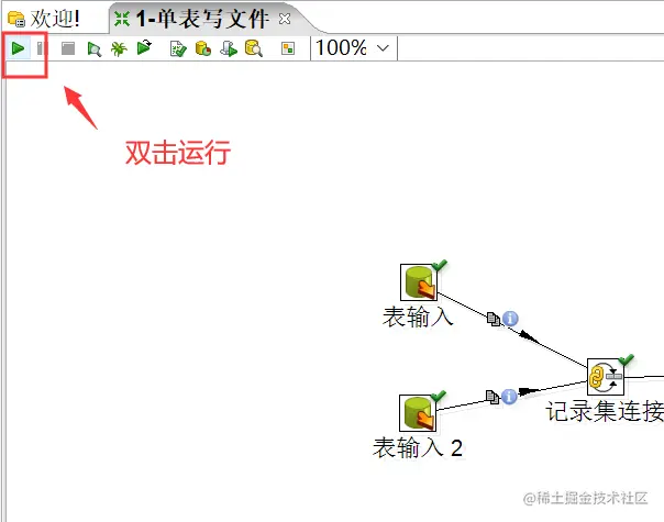 1)如上图,选择表输入(读取视图或者table数据),EXCEL输出(准备输出的EXCEL文件),连接两个控件。