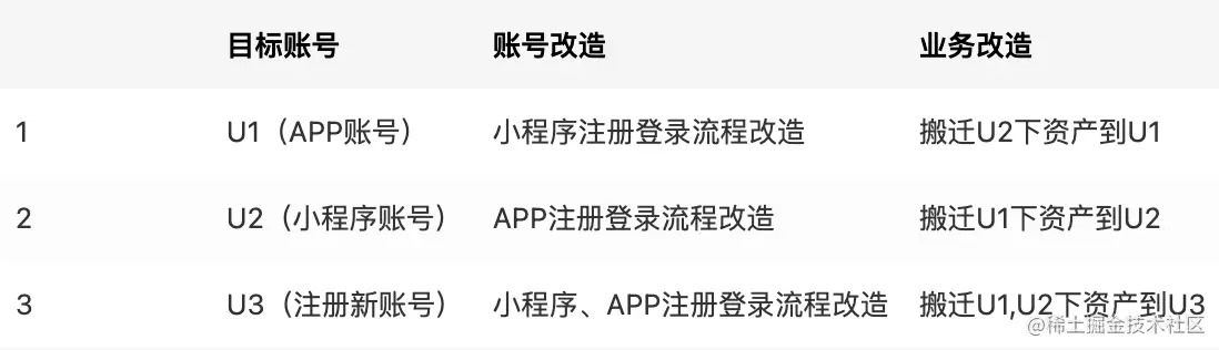 举个例子:用户有APP账号U1、小程序账号U2,这两个账号打通后承载账号、用户、资产信息的账号即目标账号。可选的目标账号有三种可选方案: