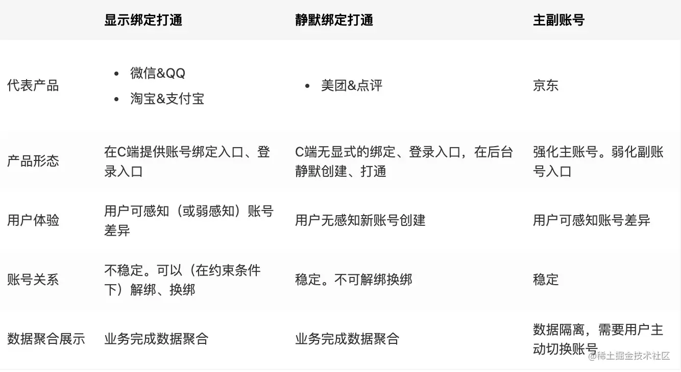- 差异:因为产品间的定位、业务复杂度等原因,通过强化绑定、弱化绑定、弱化历史数据、静默绑定等方式实现账号打通