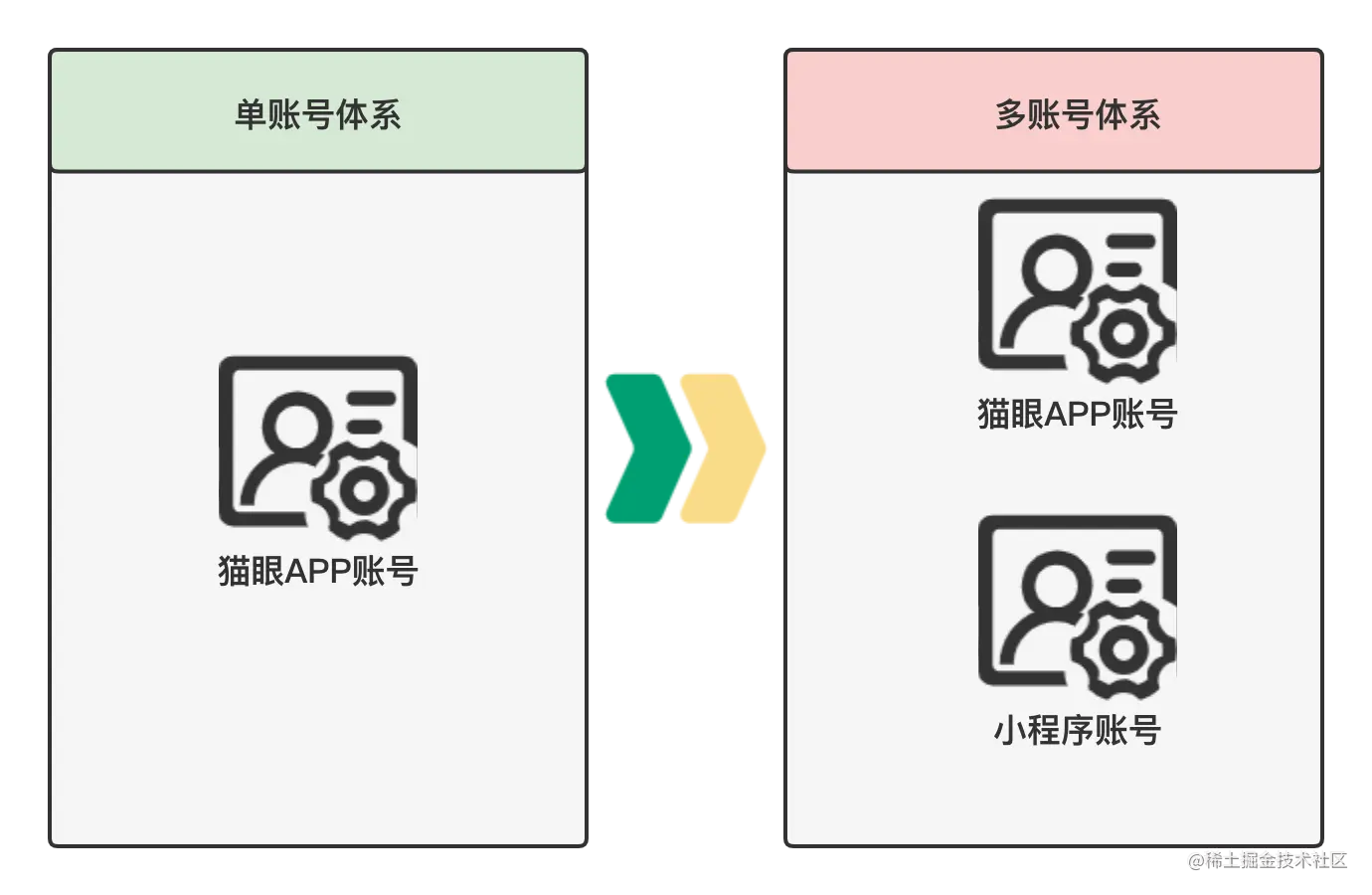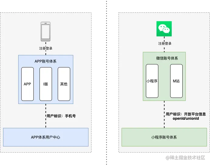 回到猫眼的场景,猫眼经历自身发展有APP、小程序两个主要的账号体系,并有以下两个特点: