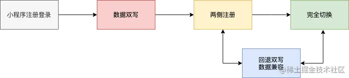 整合过程中,遵循了先增量、再存量的原则。在接口层面统一收敛后,逐步减少对小程序账号体系的依赖,逐步解耦,并在账号服务内部进行数据搬迁、清洗,尽可能对业务无感知。具体落地实践中,鉴于注册登录是典型的写场景在发布、回滚等方面天然就复杂于一般的读操作流程,并且注册登录流程作为所有核心业务的起始节点,故障将导致核心业务直接受影响,业界也频繁多次出现过因账号服务不可用导致重大业务损失的事故,我们在注册登录流程的改造上采取了小步快跑的策略,将C端注册登录流程的改造拆分为多个阶段,重点保障了各阶段的改造上线可灰度、可观测、可降级、可回滚。