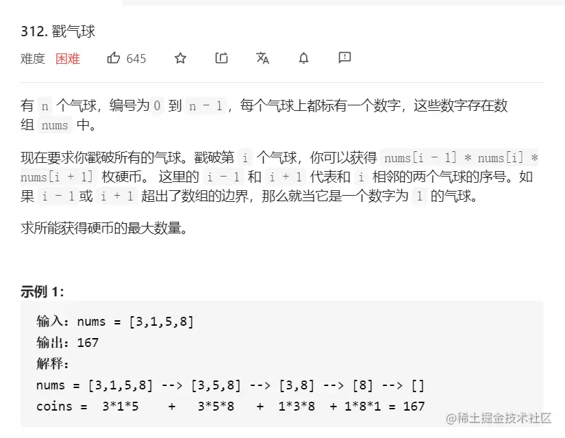 第二个坑隐藏在示例中,我们发现气球被戳爆后就不存在了,这和我们的石子合并是完全不一样的,而这种方式就让我们很难从坐标上找到正确的点来计算增长的硬币,使用正向思维是绝无可能解决这个困惑的。