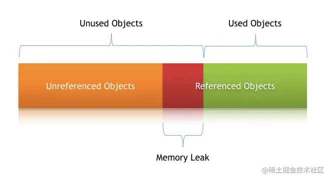 也就是一部分内存空间我明明已经使用了,却没有引用指向这部分空间。造成这片已经使用的空间无法处理的情况。