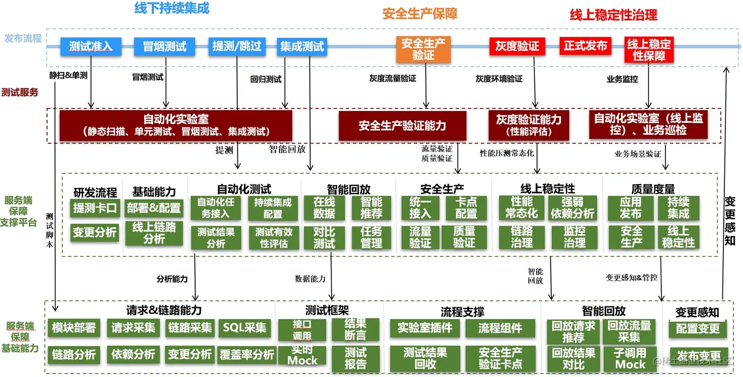 总结成一句话:服务端质量保障体系就是要构建贴合业务特性的自动化测试保障能力,并融入研发流程关键质量阶段(测试准入、冒烟测试、提测、回归测试、安全生产验证、线上发布),保障应用变更可持续集成、可持续部署、可持续发布。