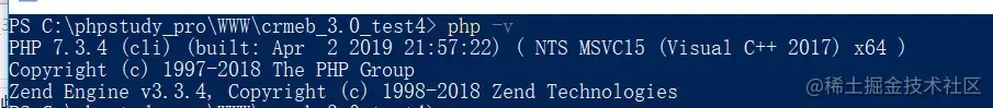 五、配置workerman,进入项目根目录 C:\phpstudy_pro\WWW\crmeb_3.0_test4 按住shift+右击 点击【在此处打开命令行】,输入php -v 查看php版本