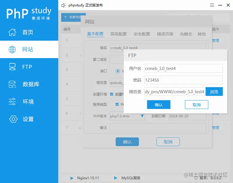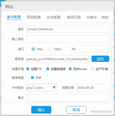 5.点击【确定】创建站点成功!域名不能带有下划线请注意!这里创建的域名已:crmeb3.0test4.net 为例,切记一定要选择好根目录为pulibc(这里的根目录因该是项目运行目录所以要配置再public下,比如FTP的根目录应该是创建的:crmeb_3.0_test4目录),如下图