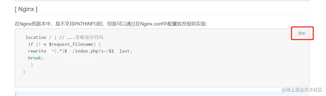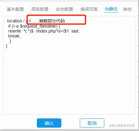点击上图红框按钮【复制】代码粘连到伪静态栏中,删除:// …..省略部分代码