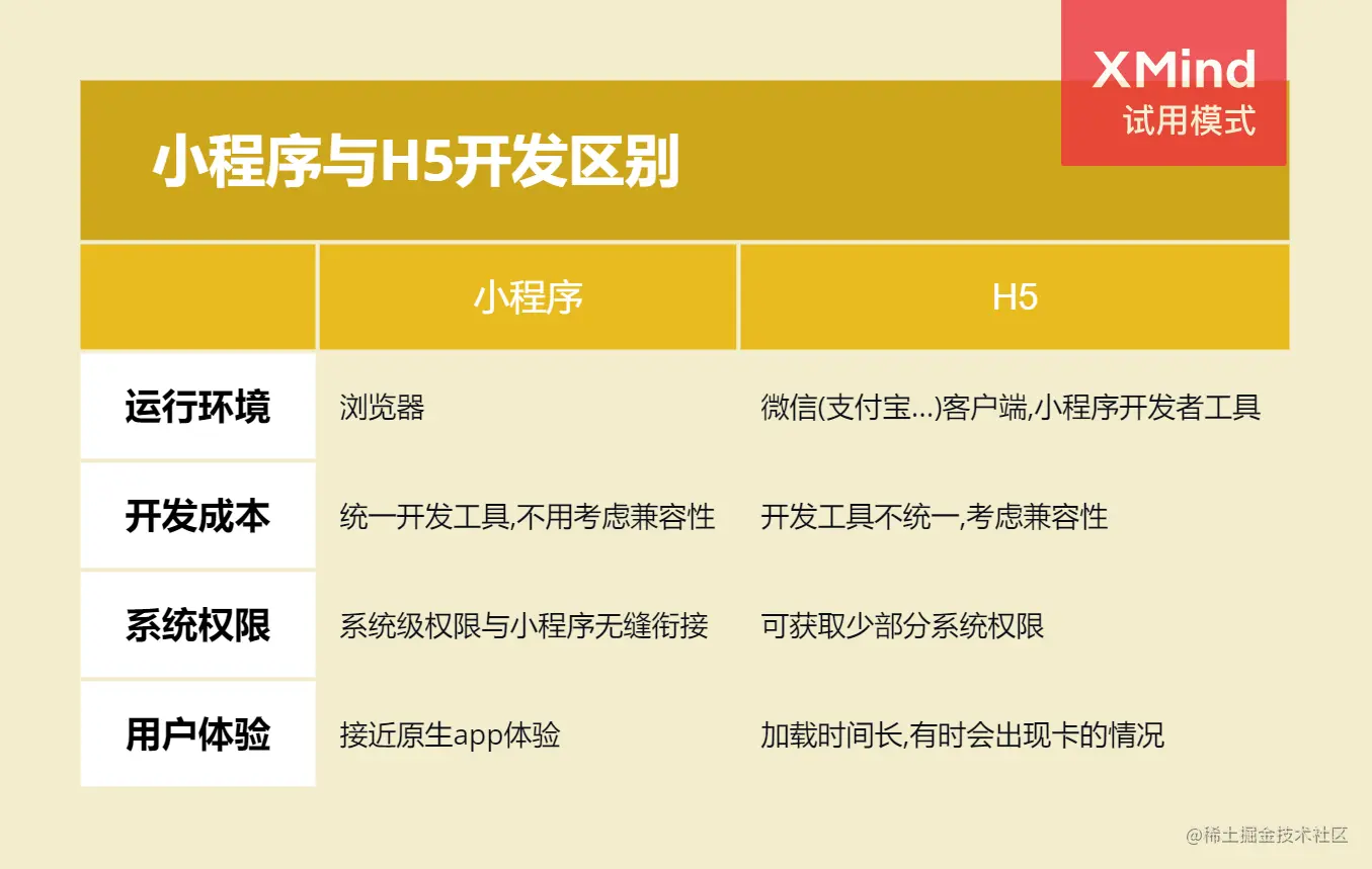 - 小程序: 微信作为原生 app 能获取到更多的系统权限,如网络通信状态、数据缓存能力等,因此小程序也能因此获取到系统级权限