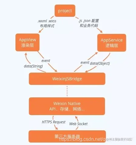 视图层和逻辑层通过系统层的JSBridage进行通信,逻辑层把数据变化通知到视图层,触发视图层页面更新,视图层把触发的事件通知到逻辑层进行业务处理 , 如下图 :