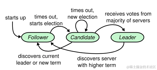 在Raft集群中,每个节点都对应一个角色,要么是Leader(领导节点),要么是Follower(跟随节点),在未选举出Leader之前,每个节点都可以是Candidate(候选节点)。