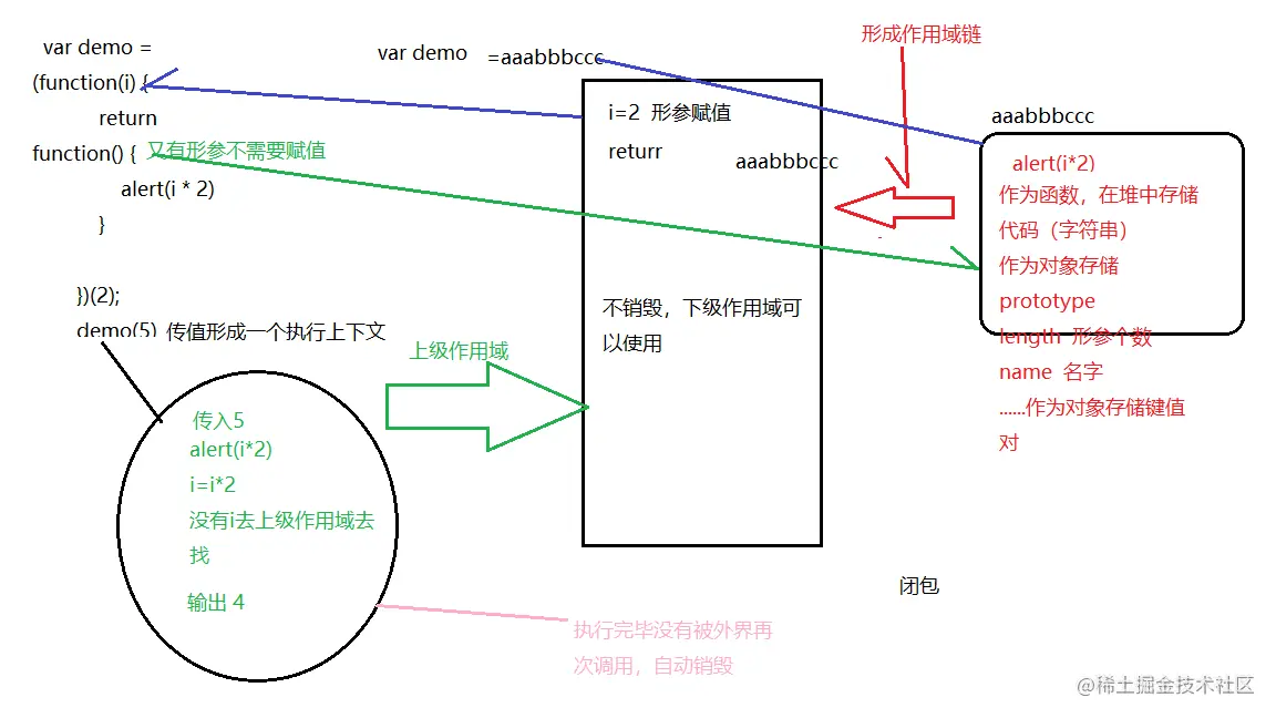 创建执行上下文,demo传参由于return fun ,fun没有形参,执行alert(i*=2)= i=i*2在创建的栈内没有i那么去它的上一级查找并调用,执行完比自动销毁,形成闭包