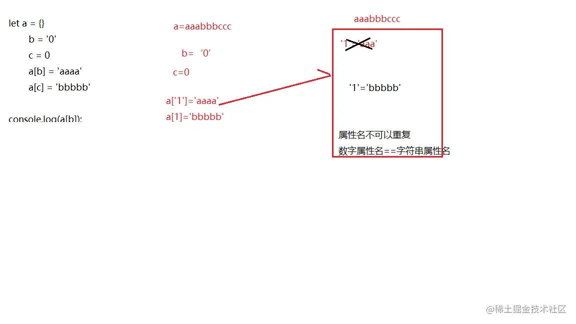 因为a是引用内存,而引用内存是按照堆来运行的而在底层运行时,a指向的是内存地址aaabbbccc,b和c分别存储为基本类型值,a[b],a[c]相当于在a中创建出a['1']/a[1],对于一个堆或者fun来说属性名不能重复,无论是字符串0还是数字0在这里都代表0,那么数组属性名是索引属性名可以为数字 ,但在对象中编译机制中数字和字符串是相等的,那么这里就可以知道a[1]不是新添加而是更改。