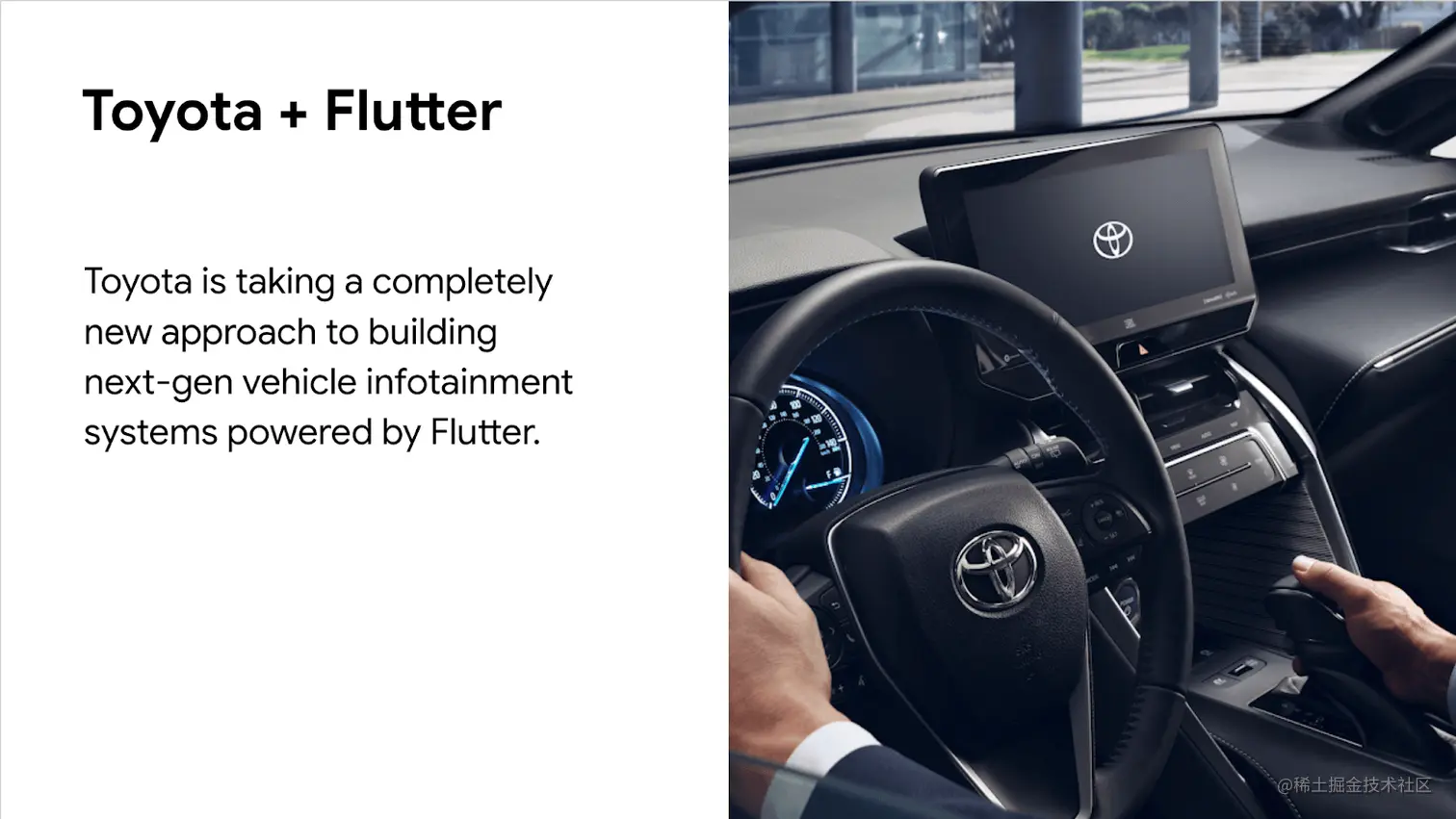 - 使用 Flutter 标志着与过去开发车载软件的方式大相径庭,丰田之所以选择 Flutter 是因为其高性能和经验的一致性,快速的迭代和开发人员的人机工程学以及智能手机层的触摸机制,通过使用 Flutter 的 embedder API,Toyota 可以针对车载系统的独特需求量身定制Flutter。