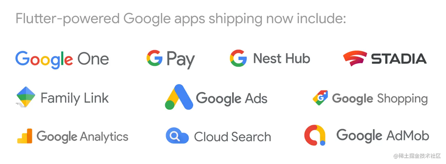 全球各大一二线公司都已经使用了 Flutter,包括它们的主流的应用程序如:微信,Grab,Yandex Go,Nubank,Sonos ,Fastic,Betterment 和 realtor.com等。 在 Google 内部也会使用 Flutter 开发,Google 内有近一千多名工程师正在使用 Dart 和Flutter 构建应用程序,其中许多产品都已经发布了,包括:Stadia,Google One和Google Nest Hub 等等。