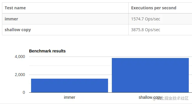 从性能的角度来看,与使用 JavaScript 中的 object.assign() 或展开运算符的浅拷贝(Shallow Copy)相比,Immer 表现得可谓是相当的好。如果你有兴趣了解更多关于性能的比较方面的信息,请参考此文:Immer vs 浅拷贝 vs 不可变性的测试。