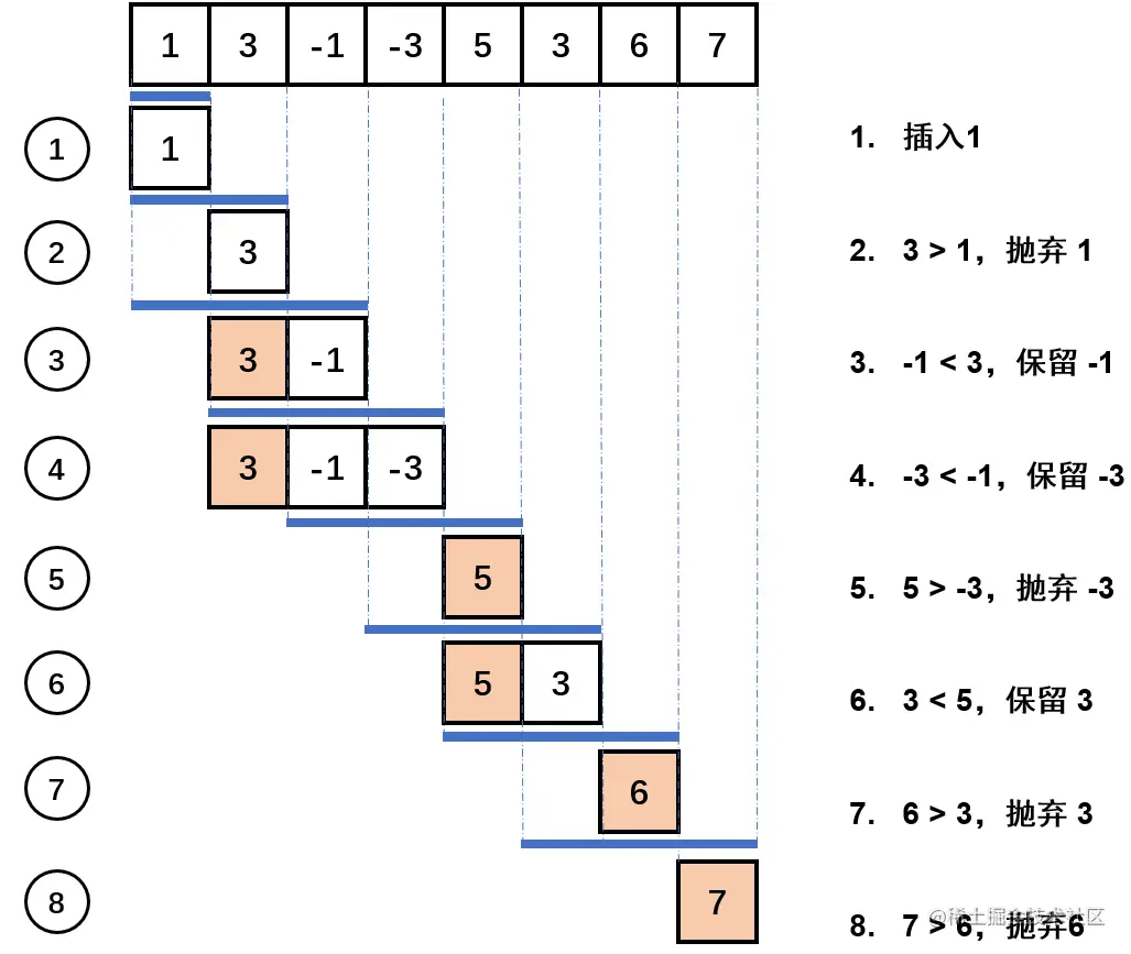 我们可以采取双端队列的方式来维护滑动窗口的最大值。这里,我们根据示例一来具体讲解这个队列是如何处理数据的,如下图所示: