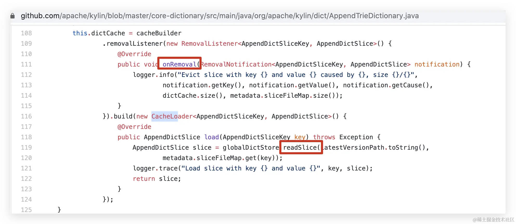 8.分析业务代码,定位到了 kylin 的这一处逻辑。大体意思是内存不够的时候,就evict 掉,然后下次算的时候,若 key 不存在,就从全局字典 load。频繁的 swap 导致频繁的 load,每次 load 都会到 hdfs 上读文件,造成了热读。
