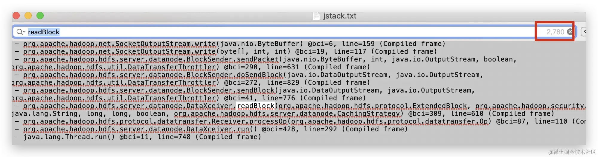 4.分析 DN 的 jstack 日志, grep DataXceiver.readBlock jstack.txt | wc -l 发现有 2K+ 个读 blk 操作,很少的写操作。