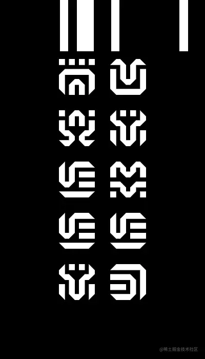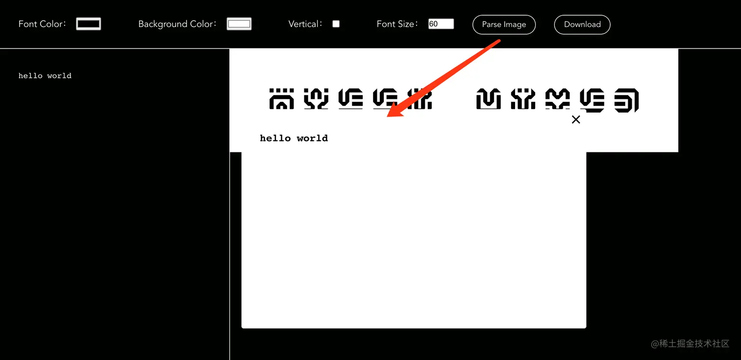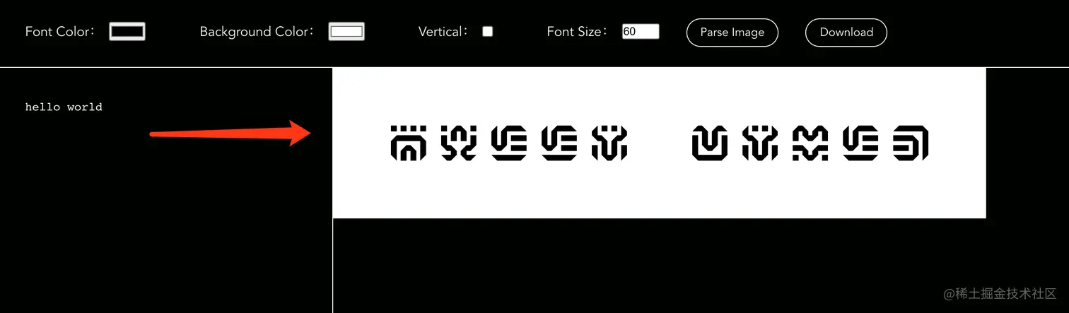 图片的首行我们塞了三个关键信息:文字排列方式(0 or 1 标识)、文字格子的大小,图片的宽度(几个格子大小),每个信息二进制为 8 bit 长度,总长度 24 位。解析时我们拿到图片我们只需要截取图片第一行(高度随意 2 ~ 4 像素足以)拆分均等的 24 份,第一份的颜色用于标识 0(因为前八位表示文字排列只有 01 两种情况,01 换成 8 位二进制前 7 位都是 0),剩下的 23 个色块颜色与第一块相同的标识为 0 不用则标识为 1,简单暴力。