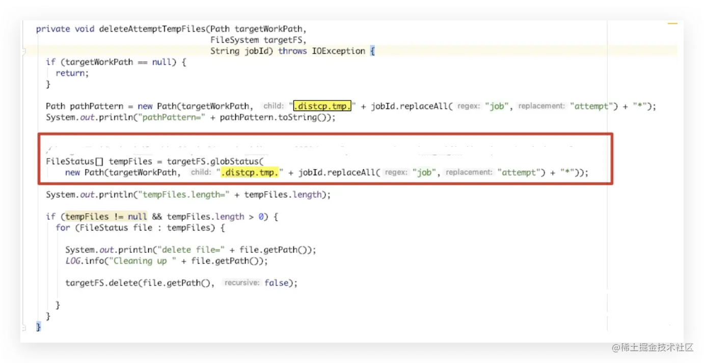 targetFS.globStatus 是根据模式匹配 targetWorkPath 路径下的所有子路径,找到满足条件的 .distcp.tmp. 路径,最后批量删除。