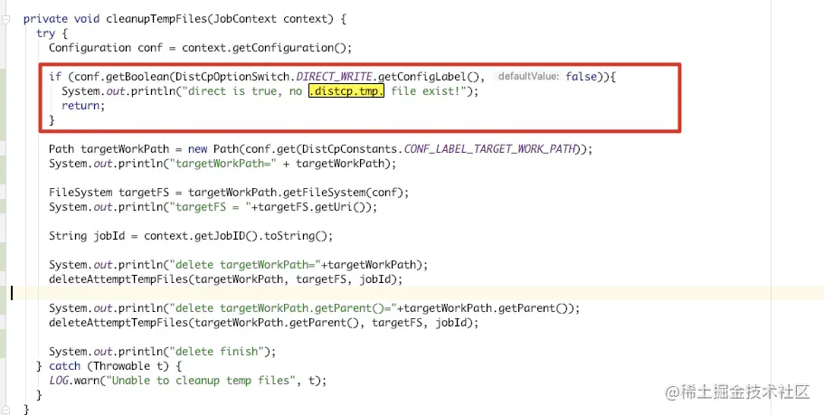 所以,当 distcp 指定 -direct 参数时候(不会生产中间文件),这块逻辑就无需触发了,因此加上判断,如果指定了 -direct 参数,那么直接返回即可