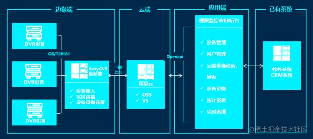 基于以上需求,我们在与园区及云平台对接后给出解决方案EasyCVR视频融合共享平台,该产品可以通过网关的形式呈现,通过GB28181协议对接现场的NVR设备,同时根据园区要求的时间段,获取设备录像。云端以阿里云为例,通过一键上云协议可以获取到EasyCVR的实时视频及设备录像,通过云端的OSS设置指定时间段录像,即可完成设备的接入,实时直播,指定时间段录像上传及存储。