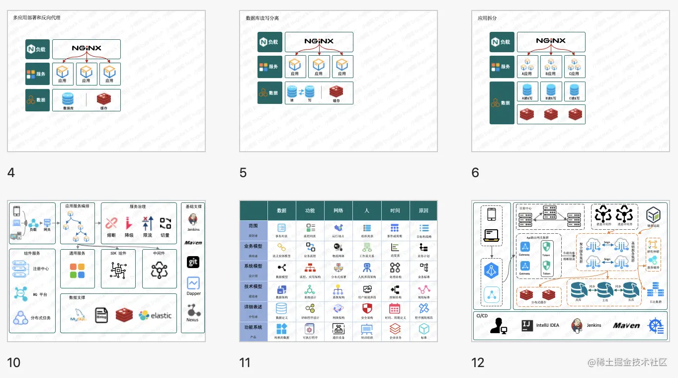 - 描述:从上到下的整个架构演变过程,我们不断的拆分应用、单独部署一直到应用细分,都是在不断的提升应用服务的能力,让各自应用体负责独立的事情。这个阶段已经开始体现出微服务的能力了,同时这个阶段也引入了上层的网关统一接入和下层的数据使用能力。