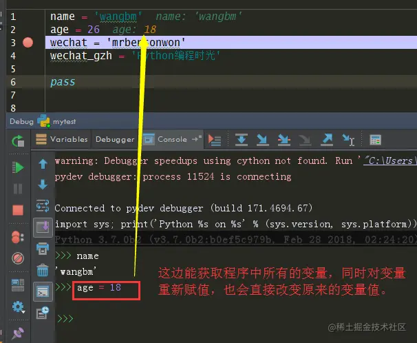 就进入了 Python Shell 的界面,这个Shell 环境和我们当前运行的程序环境是打通的,变量之间可以互相访问,这下你可以轻松地进行调试了。