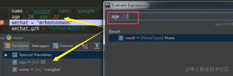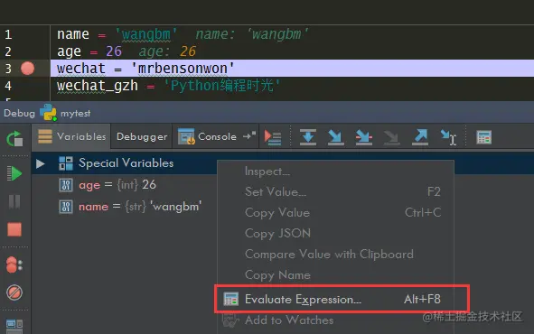 除了上面这种方法,其实还有一种方法可以在调试过程中,执行命令表达式,而这种大家可能比较熟悉了,这边也提一下,就当是汇总一下。但是从功能上来说,是没有上面这种方法来得方便易用的。因为这种方法,必须要求你使用 debug 模式运行项目,并打断点。