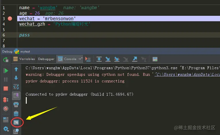 假如我在调试如下几行简单的代码。在第 3 行处打了个断点。然后点击图示位置 Show Python Prompt 按钮。