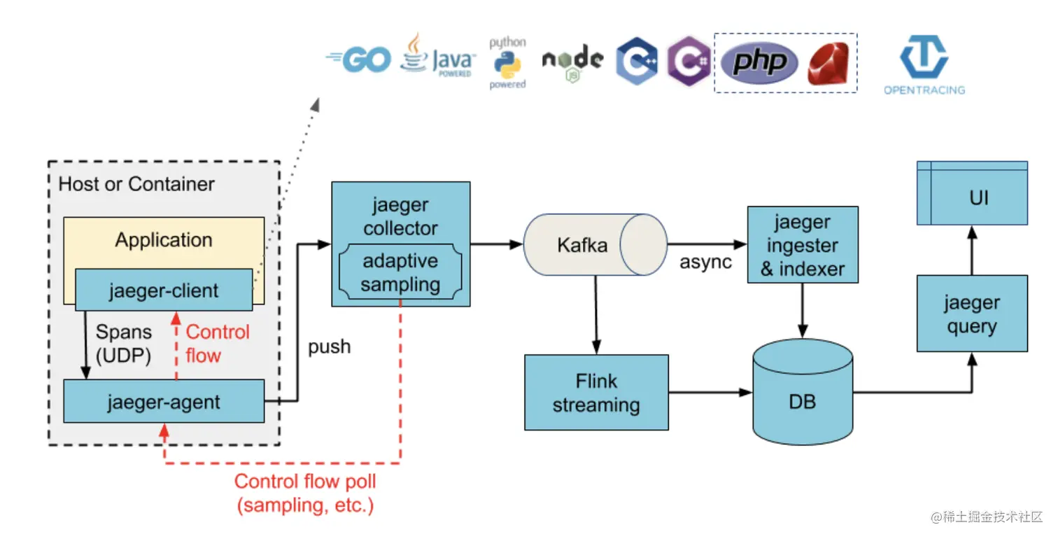 当前,业界最火热的几个链路追踪社区,如 Apache SkyWalking,Zipkin,Jaeger 都是基于 OpenTracing 发展起来的,也有逐步向 OpenTelemetry 拓展的趋势。这些开源组建一般都是从客户端接入开始,同时提供数据收集的方案(Data Collector)和数据处理的方案(Data Aggregator),最后把数据倒入到其他开源组建中,比如 Elasticsearch 和 Cassandra 等。对于大部分需要使用的客户来说,自建其实是比较麻烦的事情。比如 Jaeger 提供的实例构架图如下:
