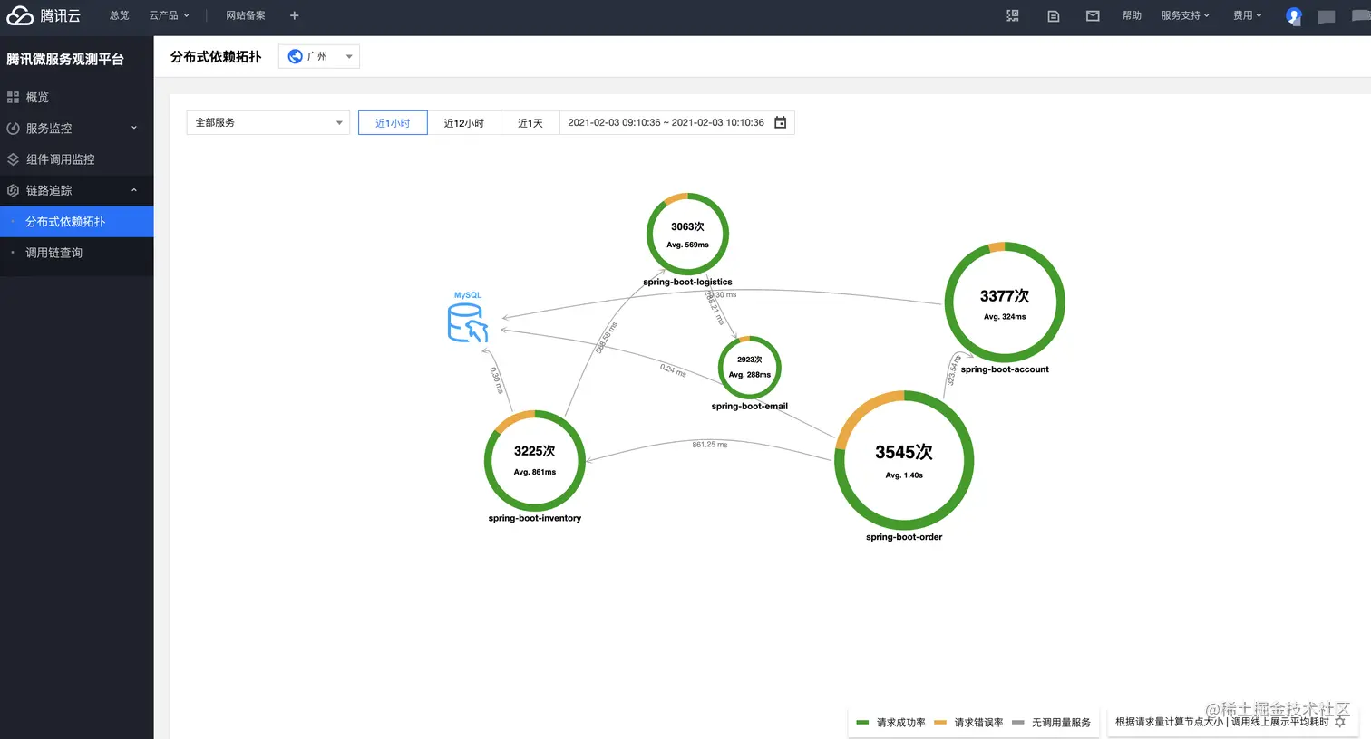除了提供链路拓扑的灵活视图和和调用链路的查询分析机制,TSW 还针对服务调用的上下游关系做了深度聚合,可以更直观的切分和对比同一调用在不同链路下的成功率和响应。
