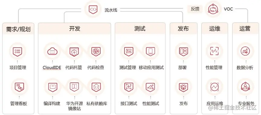 “从需求下发、代码提交、编译构建、测试与验证到部署与运维,DevCloud提供了软件研发托管运维端到端的支持。”