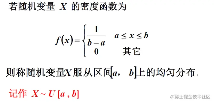 在概率论和统计学中,均匀分布也叫矩形分布,它是对称概率分布,在相同长度间隔的分布概率是等可能的。 均匀分布由两个参数a和b定义,它们是数轴上的最小值和最大值,通常缩写为U(a,b)。