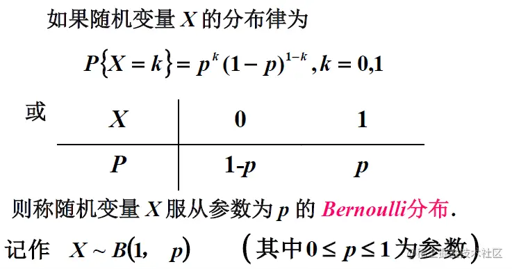 伯努利分布(Bernoulli distribution)又名两点分布或0-1分布,介绍伯努利分布前首先需要引入伯努利试验(Bernoulli trial)。