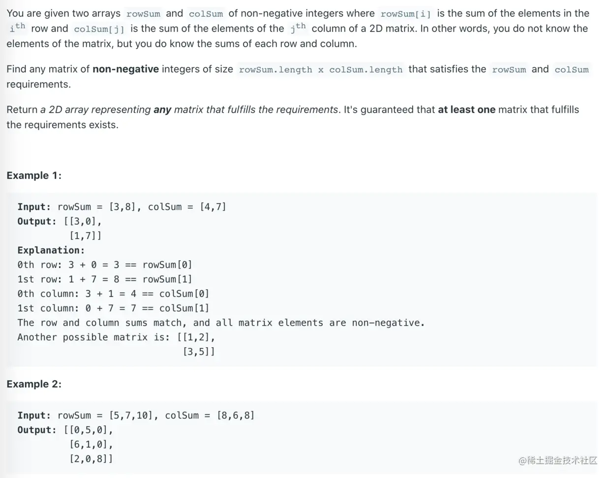 方法: 填充逻辑是这样的:填充行和与列和的较小值,然后在行和与列和中减去该值,每个位置都遵循该原则。较小值的原因是如果不是较小值,减去该值后可能为负数。