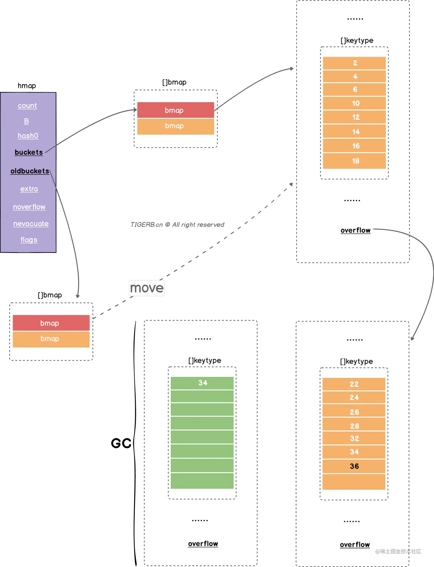 bmap对应所有溢出桶bmap的内存 - 上述整理内存过程之后,上图示中绿色的溢出桶会被GC垃圾回收