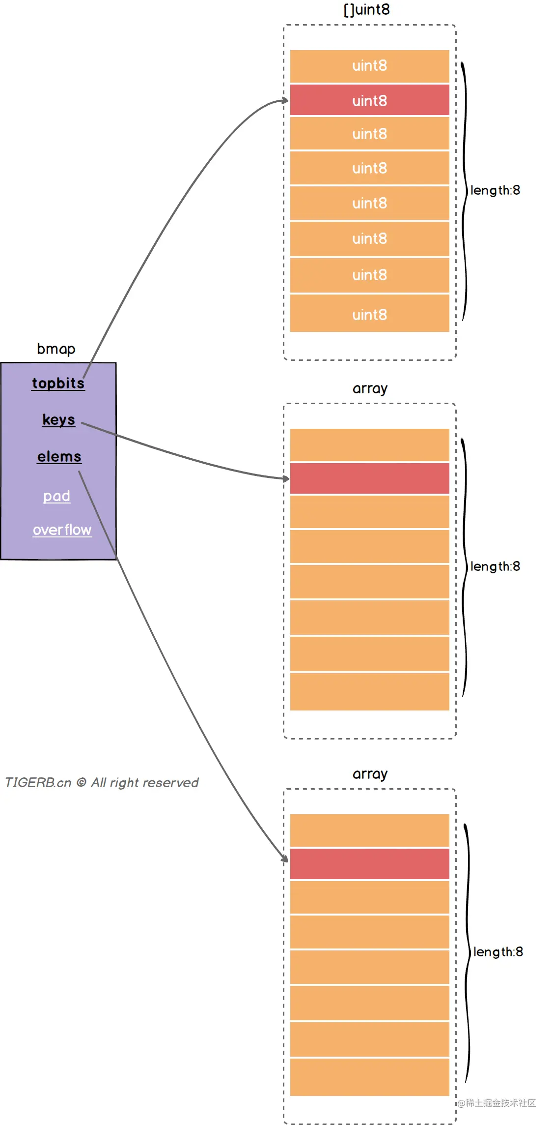 条件2. 上文我们已经假设:忽略索引为1的的`bucket`(也就是`buckets`的第2个`bmap`),仅以索引为0的`bucket`(也就是`buckets`的第1个`bmap`)里的键值为例