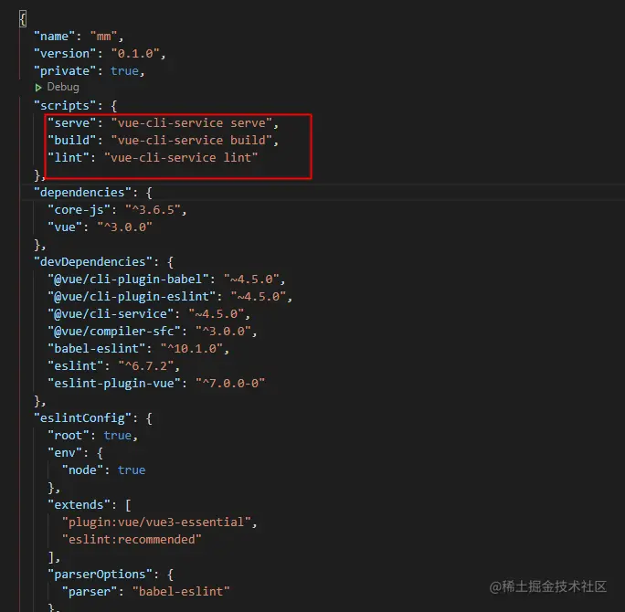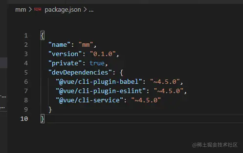 我创建的是vue3的项目, vue create mm, 项目名称是mm。此时package.json就长这样, 接下来的项目生成操作都会依赖这几个插件。