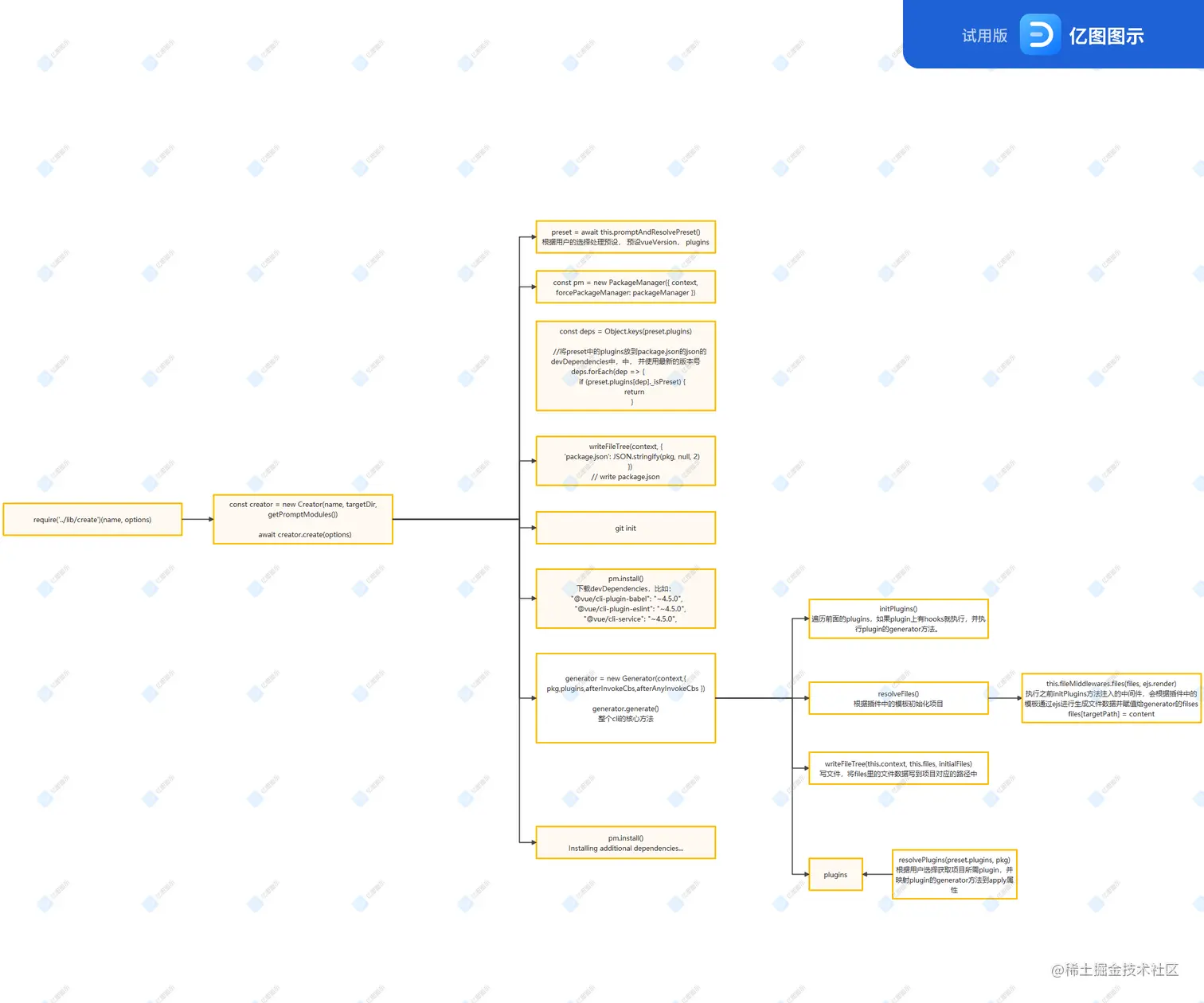 vue-cli生成项目其实就分成两块, 第一块根据用户选择配置预设,安装相应的插件, 第二块就是根据安装的插件去生成对应的项目代码。